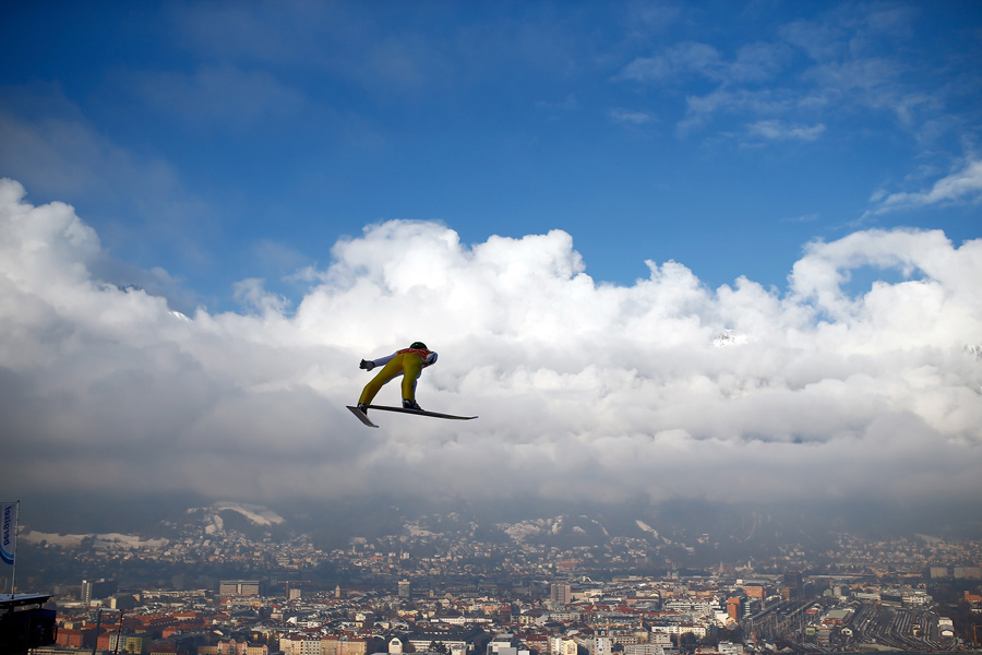 Peter Prevc of Slovenia soars through the air during a trial jump for the third jumping of the 64th four-hills ski jumping tournament in Innsbruck, Austria, on January 3, 2016.Dominic Ebenbichler / Reuters