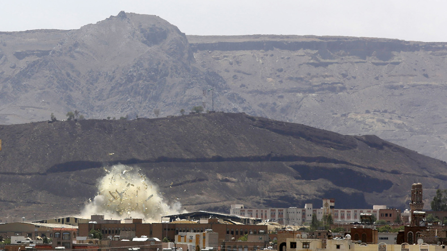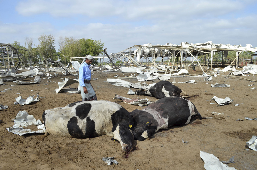 A dog walks on the rubble of a house after an air strike in Sanaa on December 29, 2015. The air strike, carried out by Saudi forces, hit a neighborhood here, killing four people and injuring four more.Xinhua Press / Corbis