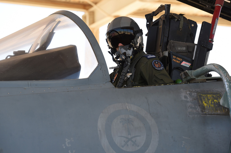A picture taken on November 16, 2015 shows a Saudi pilot sitting in a F-15 fighter jet at the Khamis Mushayt military airbase, some 880 km from Riyadh, as the Saudi army conducts operations over Yemen.Fayez Nureldine / AFP / Getty