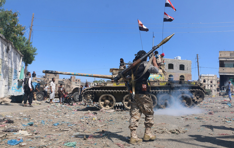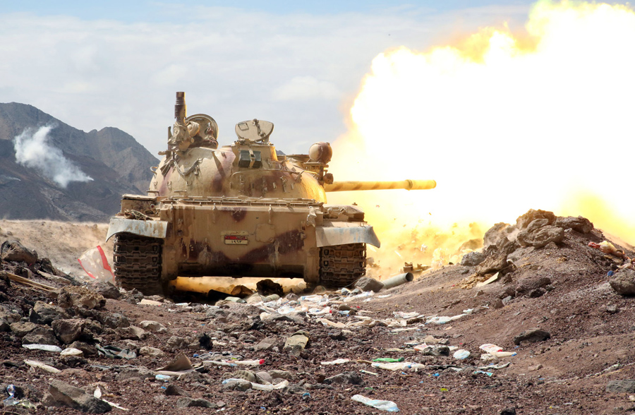 Armed Yemeni tribesmen from the Popular Resistance Committees, supporting forces loyal to Yemen's Saudi-backed President Abedrabbo Mansour Hadi, fire from a tank in the area of Sirwah, west of Marib city, on November 3, 2015.Abdullah Al-Qadry / AFP / Getty