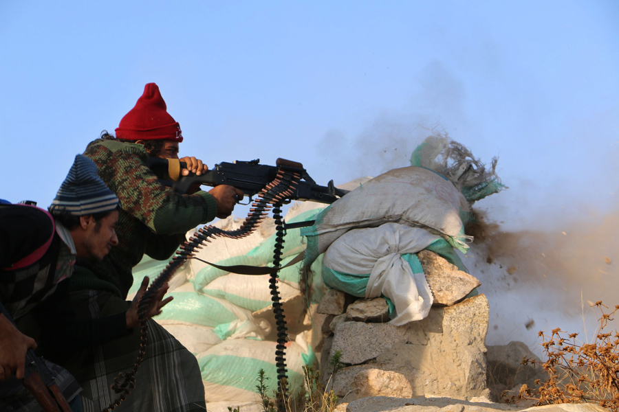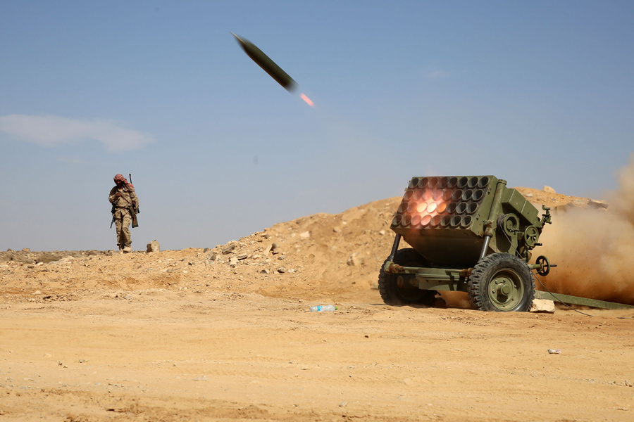 Armed Yemeni tribesmen from the Popular Resistance Committees, supporting forces loyal to Yemen's Saudi-backed President Abedrabbo Mansour Hadi, fire as they hold a position in the area of Sirwah, west of Marib city, on December 18, 2015.Abdullah Al-Qadry / AFP / Getty