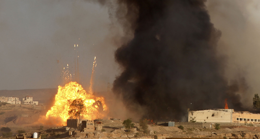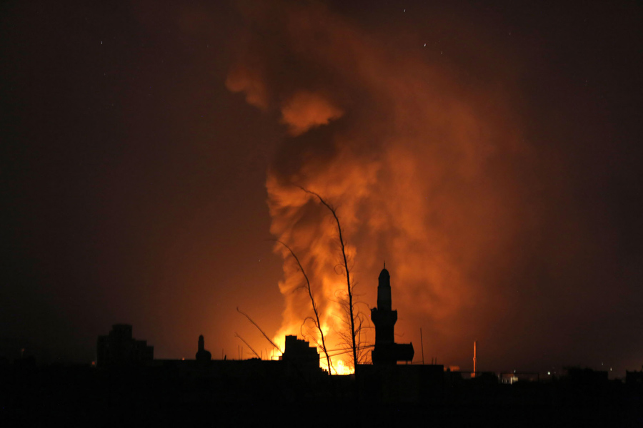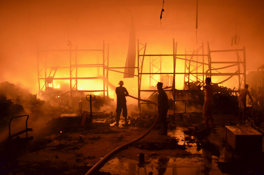 Firefighters attempt to extinguish a fire at a foodstuff storage facility destroyed by a Saudi-led air strike in Yemen's Red Sea port city of Houdieda on January 6, 2016.Abduljabbar Zeyad / Reuters