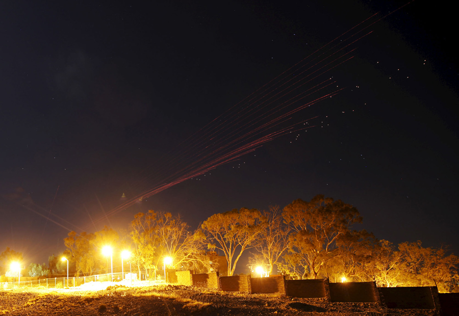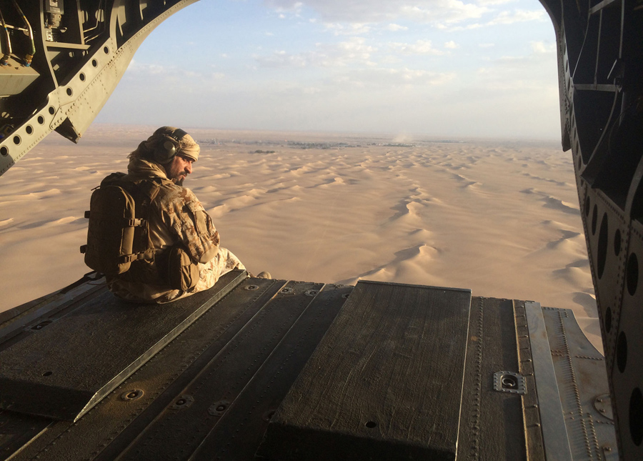 An Emirati gunner watches for enemy fire from the rear gate of a United Arab Emirates Chinook military helicopter flying over Yemen on September 17, 2015. The Saudi-led coalition targeting Yemen's Shiite rebels pounded the insurgents' positions with heavy artillery fire on the outskirts of the central city of Marib, part of their push to retake the capital, Sanaa.Adam Schreck / AP