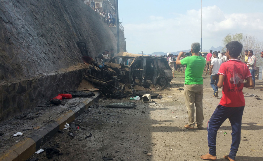 People gather at the site of a car bomb attack that killed the governor of the port city of Aden on December 6, 2015. Jaafar Mohammed Saad was killed on Sunday when a suicide bomber rammed his car into the governor's convoy in the western part of Aden city, residents and a local official said.Reuters