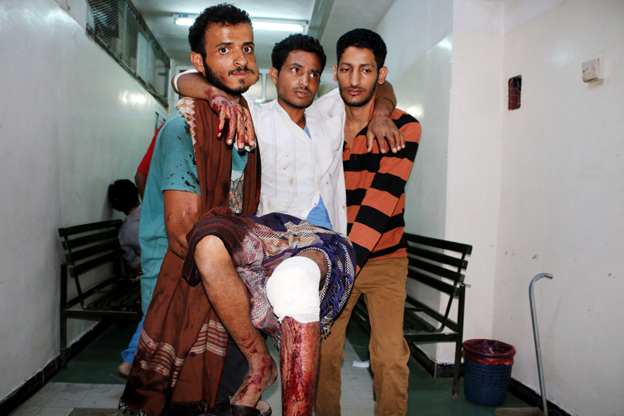 People carry a man injured from clashes between tribal fighters and Houthis in Taiz, Yemen on October 21, 2015. Shiite Houthi rebels fired mortars and rockets into the central city of Taiz, killing at least 17 civilians and wounding over 70, including women, children, and the elderly, officials said.Abdulnasser Alseddik / AP