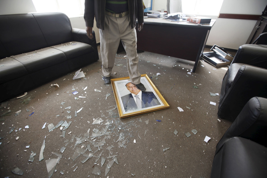 A man stands on a poster of Yemeni President Abed Rabbo Mansour Hadi among the wreckage of a municipal building destroyed by a Saudi-led air strike in Yemen's capital Sanaa, on January 3, 2016.Mohamed Al-Sayaghi / Reuters