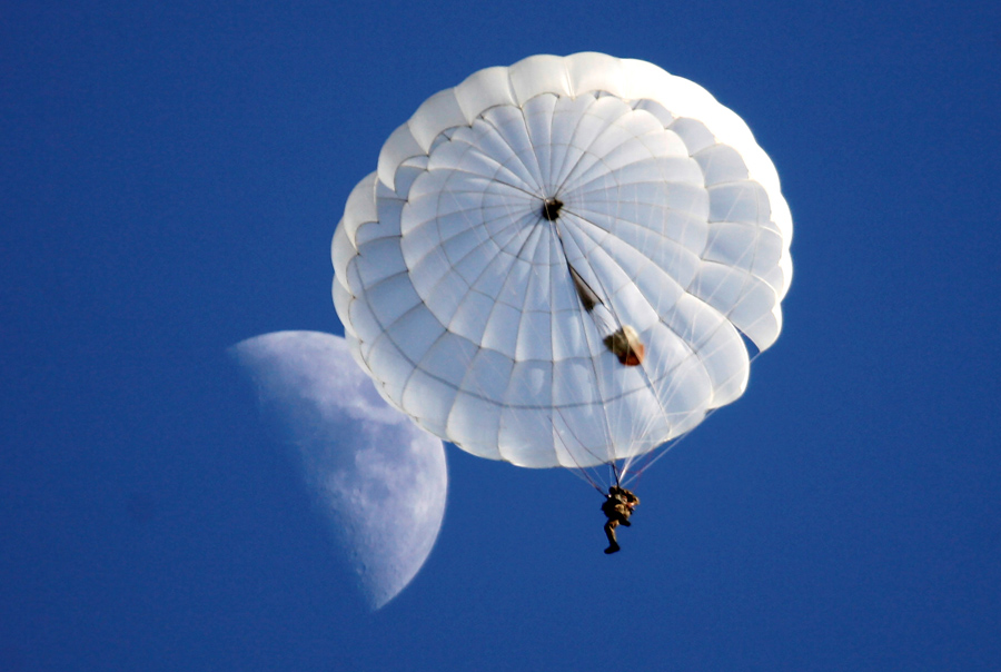 A student of the General Yermolov Cadet School parachutes from an airplane in the village of Novomaryevskaya outside the southern city of Stavropol, Russia, on May 13, 2016.Eduard Korniyenko / Reuters
