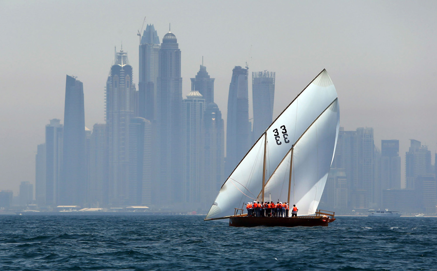 Emiratis sail during the Al-Gaffal traditional long-distance dhow sailing race between the island of Sir Bu Nair, near the Iranian coast, and the Gulf emirate of Dubai on May 20, 2016.Marwan Naamani / AFP / Getty