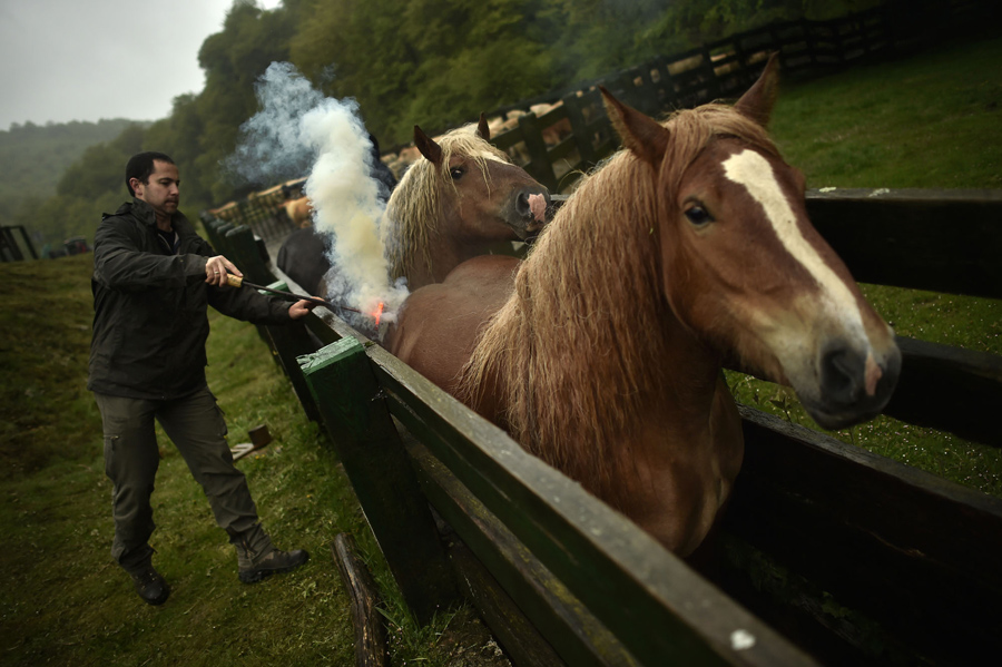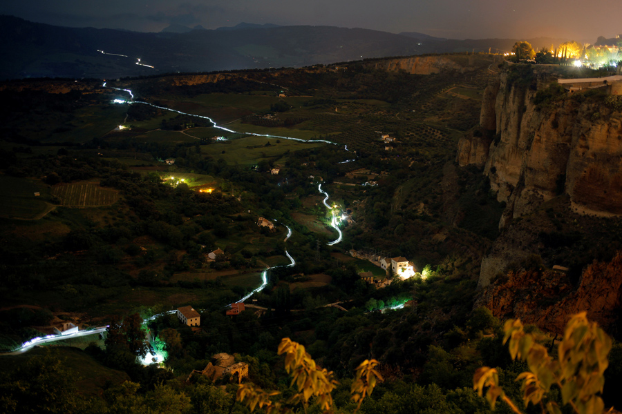Trails of headlamps are seen in the night as runners and mountain bikers make their way to the finish line (top right) as they participate in the XIX 101km international competition in Ronda, Spain, late on May 14, 2016. About 8,000 participants, including runners and mountain bikers, ran a track of 101 kilometers (63 miles) in less than 24 hours. Participants made their way through the Serrania de Ronda, or Ronda Mountain Range, during the competition organized by the Fourth Tercio, or Fourth Regiment, “Alejandro Farnesio” of the Spanish Legion.Jon Nazca / Reuters