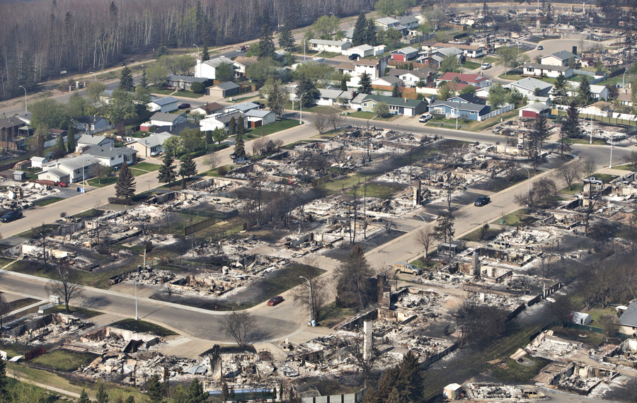 An aerial view of the neighborhoods devastated by the wildfire that forced the evacuation of the city seen during Canadian Prime Minister Justin Trudeau's helicopter tour in Fort McMurray, Alberta, Canada, on May 13, 2016.Jason Franson / Reuters