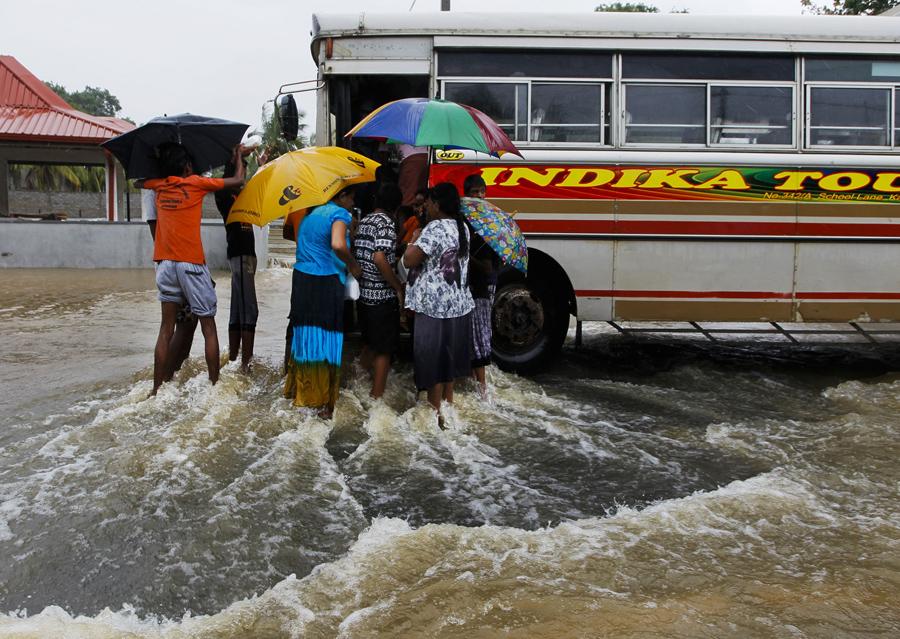 Sri Lankan flood victims flock around a bus to receive food parcels on a inundated road in Colombo, Sri Lanka, on May 17, 2016. The Disaster Management Center said that 114 homes had been destroyed and more than 137,000 people were evacuated to safe locations as heavy rains continue.Eranga Jayawardena / AP