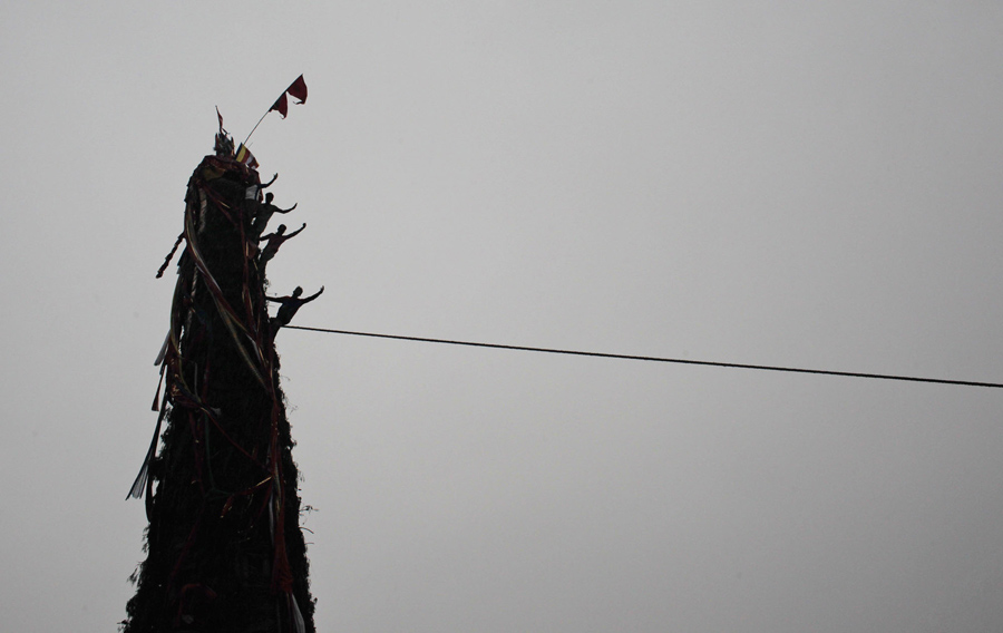 Nepalese devotees gesture to other devotees to pull during the Rato Machindranath chariot festival in Lalitpur, Nepal, on May 17, 2016. Members of Nepal’s Newar community believe celebrating this festival brings rain, good crops, and prosperity.Niranjan Shrestha / AP